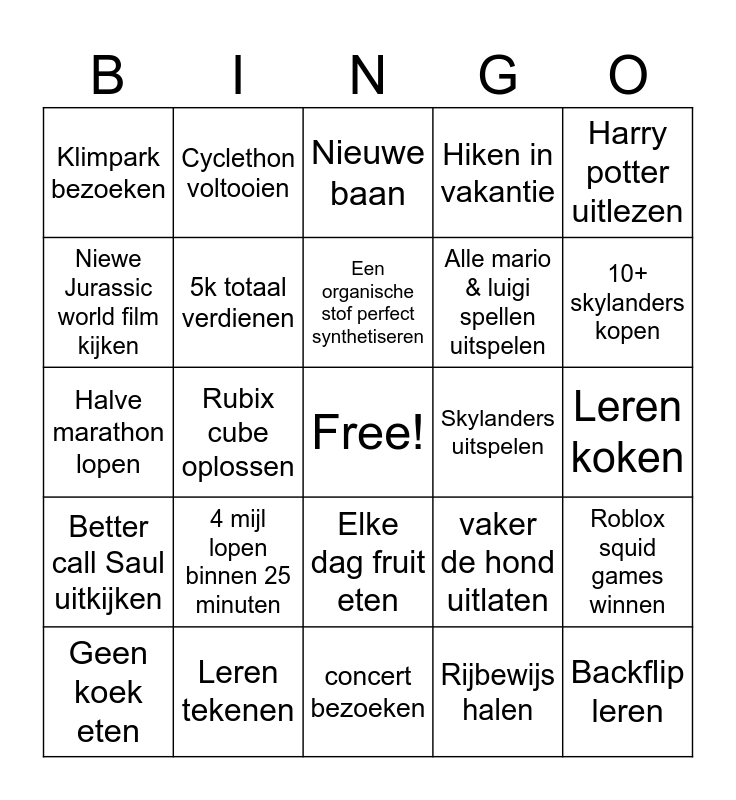 This bingo card has a free space and 24 words: 4 mijl lopen binnen 25 minuten, Leren tekenen, Een organische stof perfect synthetiseren, Geen koek eten, Harry potter uitlezen, Klimpark bezoeken, Niewe Jurassic world film kijken, Cyclethon voltooien, Skylanders uitspelen, Elke dag fruit eten, Alle mario & luigi spellen uitspelen, Halve marathon lopen, vaker de hond uitlaten, Roblox squid games winnen, 5k totaal verdienen, Rijbewijs halen, Leren koken, Nieuwe baan, 10+ skylanders kopen, Rubix cube oplossen, Backflip leren, Better call Saul uitkijken, Hiken in vakantie and concert bezoeken.