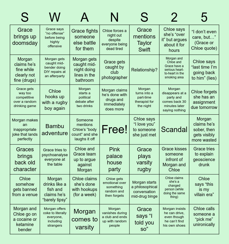 This bingo card has a free space and 48 words: Graces brings back old character, Bambu adventure, Morgan comes to varsity, Pink palace house party, Relationship?, Scandal, “I don’t even care, but…” (Grace or Chloe quote), Morgan and Chloe go on a cocaine or ketamine bender, Chloe hooks up with a rugby boy again, Someone mentions Chloe’s “body count” and she laughs it off, Chloe forces a night out despite everyone being dead tired, Grace mentions Taylor Swift, Morgan disappears at a party and comes back 30 minutes later saying nothing, Chloe forgets she has an assignment due tomorrow, Morgan makes an inappropriate joke that lands perfectly, Morgan drinks like a fish and claims he’s “barely tipsy”, Grace fights someone else battle for them, Morgan claims he’s done with drugs and immediately does more, Morgan starts a philosophical conversation mid-drug binge, Chloe says she’s “over it” but argues about it for hours, Chloe says “last time I’m going back to him” (lies), Morgan claims he’s fine while clearly not fine (drugs), Grace says “no offense” before being highly offensive, Morgan gets caught mid-night doing lines in the bathroom, Grace says “I told you so”, Morgan and Chloe and Grace have a serious heart-to-heart in the smoking area, Morgan claims he’s sober, then gets visibly more wasted, Chloe somehow gets banned from a venue, Grace tries to psychoanalyse everyone at the table, Morgan starts a political debate after two drinks, Chloe gets emotional over something random and then forgets, Morgan turns into a part-time therapist for the night, Chloe claims she’s a changed person (while doing the same thing), Chloe says “this is my villain era”, Grace brings up doomsday, Morgan offers coke to literally everyone, including strangers, Chloe and Grace team up to argue against Morgan, Morgan vanishes during a club and ends up with random people, Chloe says “I love you” to someone she just met, Morgan insists he can drive, even though he can’t find his own shoes, Grace tries to explain geoscience drunk, Grace gets way too competitive over a random drinking game, Morgan gets caught mid-bender doing DIY repairs at an afterparty, Chloe claims she’s done with hookups (for a week), Grace gets caught by club photographer, Grace plays varsity rugby, Grace kisses someone infront of Morgan and Chloe and Chloe calls someone a “pick me” unironically.