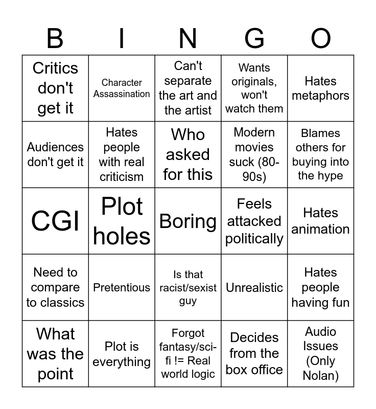 This bingo card has a free space and 24 words: Pretentious, Plot is everything, Who asked for this, What was the point, Hates metaphors, Critics don't get it, Audiences don't get it, Character Assassination, Feels attacked politically, Is that racist/sexist guy, Modern movies suck (80-90s), CGI, Unrealistic, Hates people having fun, Hates people with real criticism, Decides from the box office, Hates animation, Can't separate the art and the artist, Blames others for buying into the hype, Plot holes, Audio Issues (Only Nolan), Need to compare to classics, Wants originals, won't watch them and Forgot fantasy/sci-fi != Real world logic.