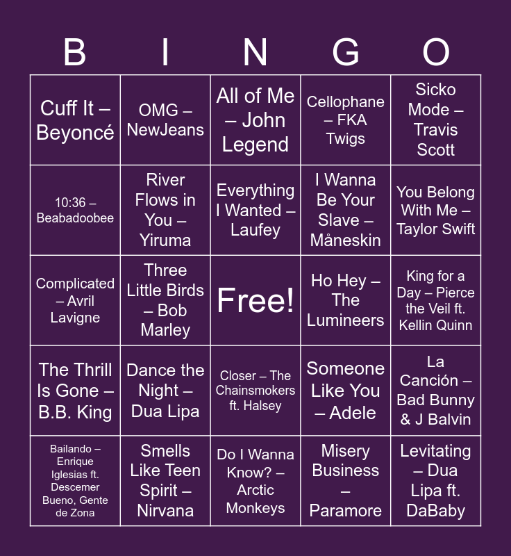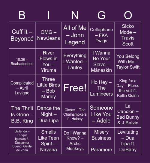 This bingo card has a free space and 25 words: Dance the Night – Dua Lipa, Do I Wanna Know? – Arctic Monkeys, Everything I Wanted – Laufey, Bailando – Enrique Iglesias ft. Descemer Bueno, Gente de Zona, Sicko Mode – Travis Scott, Cuff It – Beyoncé, 10:36 – Beabadoobee, OMG – NewJeans, Ho Hey – The Lumineers, Closer – The Chainsmokers ft. Halsey, I Wanna Be Your Slave – Måneskin, Complicated – Avril Lavigne, Someone Like You – Adele, La Canción – Bad Bunny & J Balvin, River Flows in You – Yiruma, God's Plan – Drake, King for a Day – Pierce the Veil ft. Kellin Quinn, All of Me – John Legend, You Belong With Me – Taylor Swift, Three Little Birds – Bob Marley, Levitating – Dua Lipa ft. DaBaby, Smells Like Teen Spirit – Nirvana, The Thrill Is Gone – B.B. King, Cellophane – FKA Twigs and Misery Business – Paramore.
