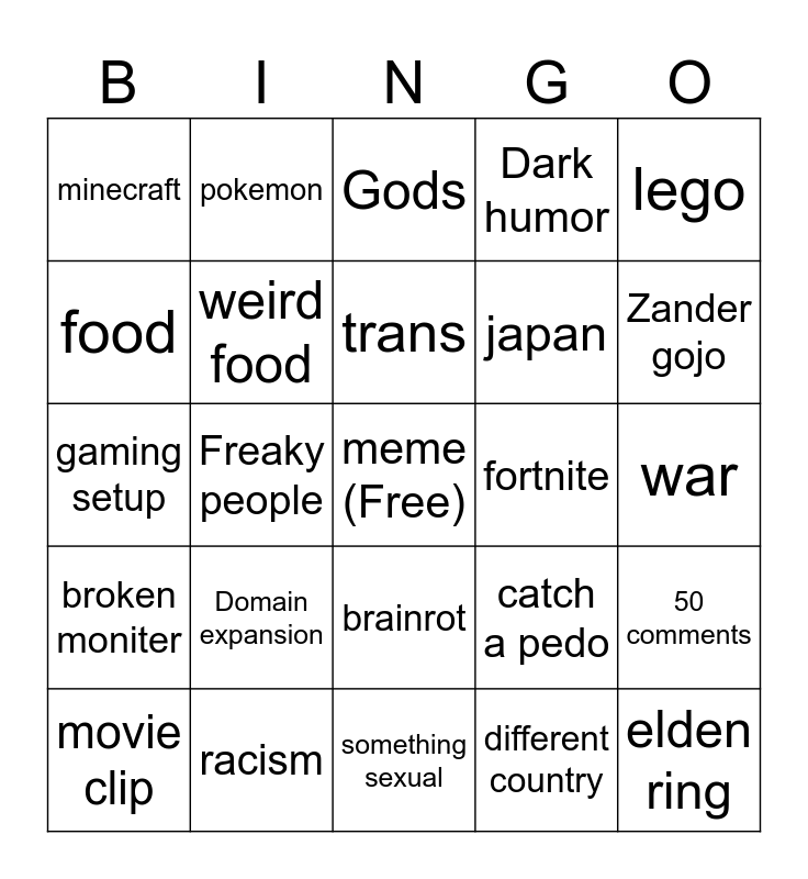 This bingo card has a free space and 24 words: Domain expansion, racism, trans, movie clip, lego, minecraft, food, pokemon, fortnite, brainrot, japan, gaming setup, catch a pedo, 50 comments, weird food, different country, war, Gods, Zander gojo, Freaky people, elden ring, broken moniter, Dark humor and something sexual.