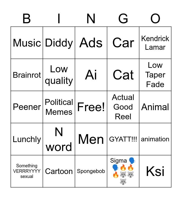 This bingo card has a free space and 24 words: N word, Cartoon, Ai, Something VERRRYYYY sexual, Kendrick Lamar, Music, Brainrot, Diddy, Actual Good Reel, Men, Cat, Peener, GYATT!!!, animation, Low quality, Sigma π£οΈπ£οΈπ₯π₯π₯πΊπΊπΊ, Animal, Ads, Low Taper Fade, Political Memes, Ksi, Lunchly, Car and Spongebob.