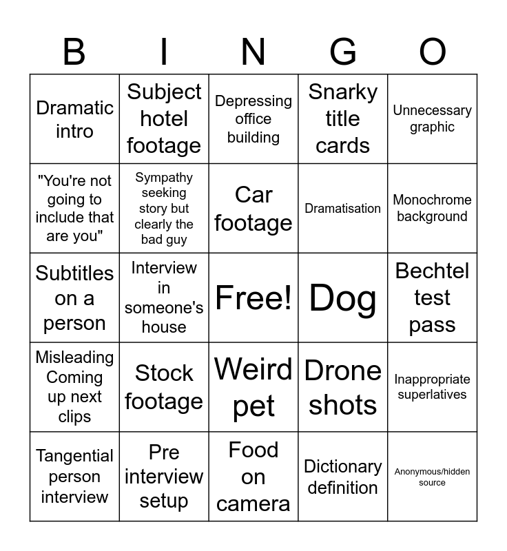 This bingo card has a free space and 24 words: Stock footage, Pre interview setup, Car footage, Tangential person interview, Unnecessary graphic, Dramatic intro, "You're not going to include that are you", Subject hotel footage, Dog, Weird pet, Dramatisation, Subtitles on a person, Drone shots, Inappropriate superlatives, Sympathy seeking story but clearly the bad guy, Dictionary definition, Bechtel test pass, Depressing office building, Monochrome background, Interview in someone's house, Anonymous/hidden source, Misleading Coming up next clips, Snarky title cards and Food on camera.