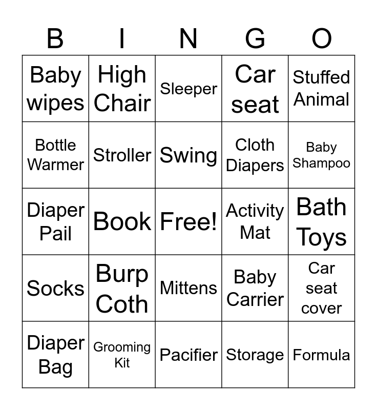 This bingo card has a free space and 46 words: Bottle, Formula, Pump Accessories, Pacifier, Burp Coth, Nursing Pillow, High Chair, Sippy Cup, Bottle Warmer, Bib, Stroller, Car seat, Car seat cover, Baby Carrier, Pack-n-Play, Bouncer, Swing, Activity Mat, Toy, Stuffed Animal, Book, Storage, Baby wipes, Cloth Diapers, Baby Powder, Baby Shampoo, Diaper Bag, Hat, Mittens, Socks, Shoes, Swaddles, Crib Sheets, Sound Machine, Baby Monitor, Grooming Kit, Bath Toys, Mobile, Blanket, Humidifier, Onsie, Sleeper, Diaper Pail, Nursery Decor, Teether and Bath Toys.