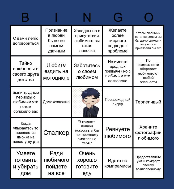 This bingo card has a free space and 24 words: Сталкер, Ради любимого пойдете на все, Заботитесь о своем любимом, Умеете готовить и убирать дом, Чтобы любимый остался рядом вы бы даже сломали ему ноги и привязали бы его, С вами легко договориться, Тайно влюблены в своего друга детства, Признание в любви было не самым удачным, Превосходный лидер, "В комнате, полной искусств, я бы по- прежнему смотрел на тебя ", Не имеете вредных привычек но с любимым это дозволено, Были трудные периоды с любимым что потом сблизило вас, Ревнуете любимого, Храните фотографии любимого, Любите ездить на мотоцикле, Идёте на компрамисы, Терпеливый, Холодны но в присутствии любимого вы такая лапочка, По возможности оберегает любимого от любой опасности, Домохозяюшка, Предоставляете уют и комфорт своему возлюбленному, Когда улыбаетесь то появляется ямочка на левом углу рта, Желаете более мирного подхода к проблеме and Очень хорошо готовите еду.