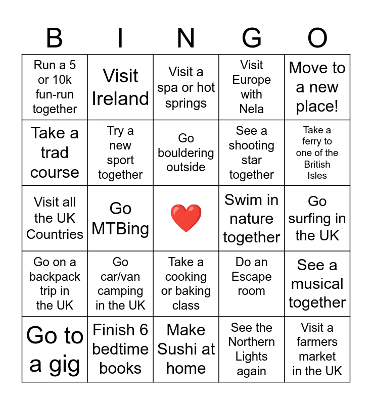This bingo card has a free space and 24 words: Go car/van camping in the UK, Finish 6 bedtime books, Go bouldering outside, Go to a gig, Move to a new place!, Run a 5 or 10k fun-run together, Take a trad course, Visit Ireland, Swim in nature together, Take a cooking or baking class, See a shooting star together, Visit all the UK Countries, Do an Escape room, See a musical together, Try a new sport together, See the Northern Lights again, Go surfing in the UK, Visit a spa or hot springs, Take a ferry to one of the British Isles, Go MTBing, Visit a farmers market in the UK, Go on a backpack trip in the UK, Visit Europe with Nela and Make Sushi at home.