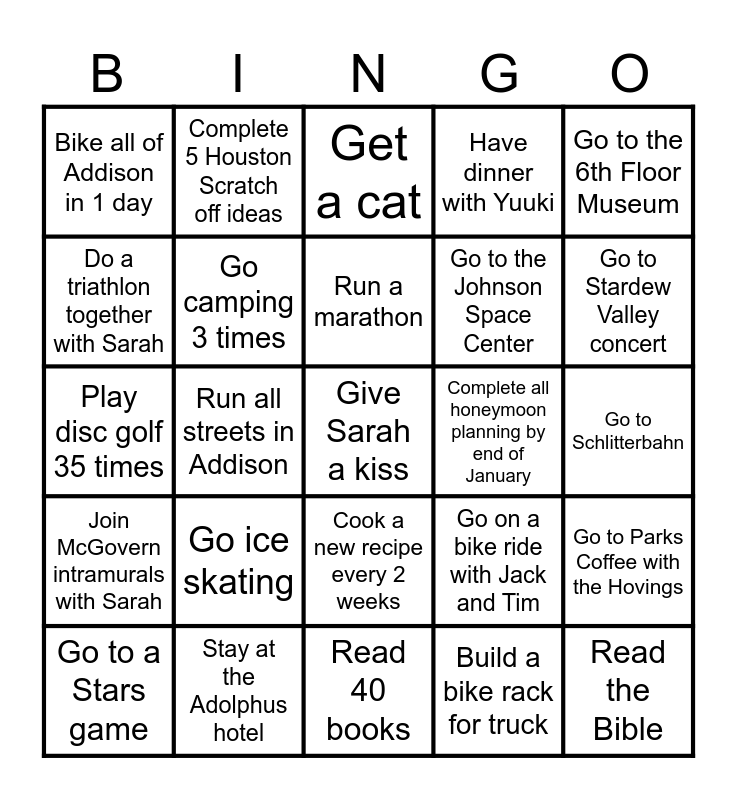 This bingo card has a free space and 24 words: Go ice skating, Stay at the Adolphus hotel, Run a marathon, Go to a Stars game, Go to the 6th Floor Museum, Bike all of Addison in 1 day, Do a triathlon together with Sarah, Complete 5 Houston Scratch off ideas, Complete all honeymoon planning by end of January, Cook a new recipe every 2 weeks, Go to the Johnson Space Center, Play disc golf 35 times, Go on a bike ride with Jack and Tim, Go to Parks Coffee with the Hovings, Go camping 3 times, Build a bike rack for truck, Go to Schlitterbahn, Get a cat, Go to Stardew Valley concert, Run all streets in Addison, Read the Bible, Join McGovern intramurals with Sarah, Have dinner with Yuuki and Read 40 books.