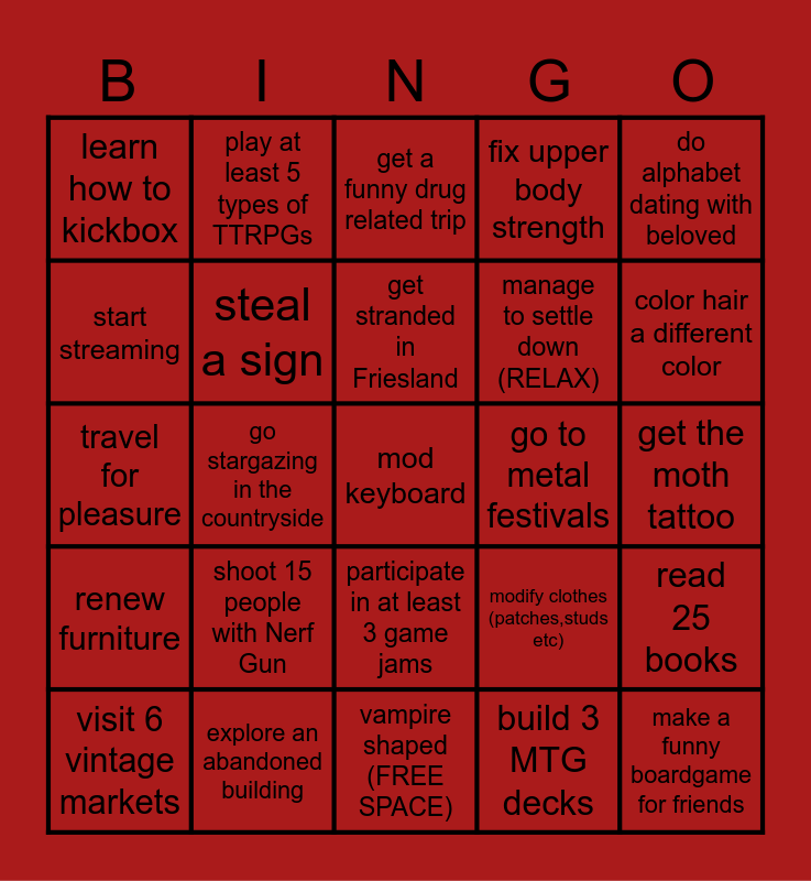 This bingo card has 25 words: renew furniture, explore an abandoned building, mod keyboard, build 3 MTG decks, do alphabet dating with beloved, learn how to kickbox, play at least 5 types of TTRPGs, get a funny drug related trip, go to metal festivals, read 25 books, start streaming, steal a sign, vampire shaped (FREE SPACE), modify clothes (patches,studs etc), color hair a different color, visit 6 vintage markets, go stargazing in the countryside, get stranded in Friesland, manage to settle down (RELAX), get the moth tattoo, travel for pleasure, shoot 15 people with Nerf Gun, participate in at least 3 game jams, fix upper body strength and make a funny boardgame for friends.