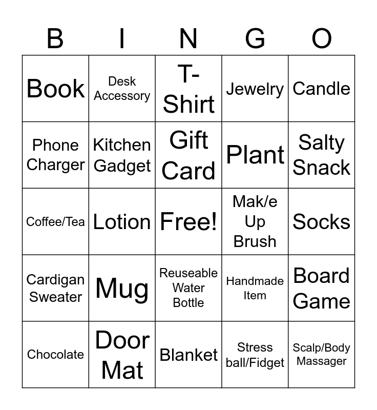 This bingo card has a free space and 24 words: Mug, Door Mat, Gift Card, Chocolate, Candle, Book, Phone Charger, Desk Accessory, Mak/e Up Brush, Reuseable Water Bottle, Plant, Coffee/Tea, Handmade Item, Board Game, Kitchen Gadget, Stress ball/Fidget, Socks, T-Shirt, Salty Snack, Lotion, Scalp/Body Massager, Cardigan Sweater, Jewelry and Blanket.