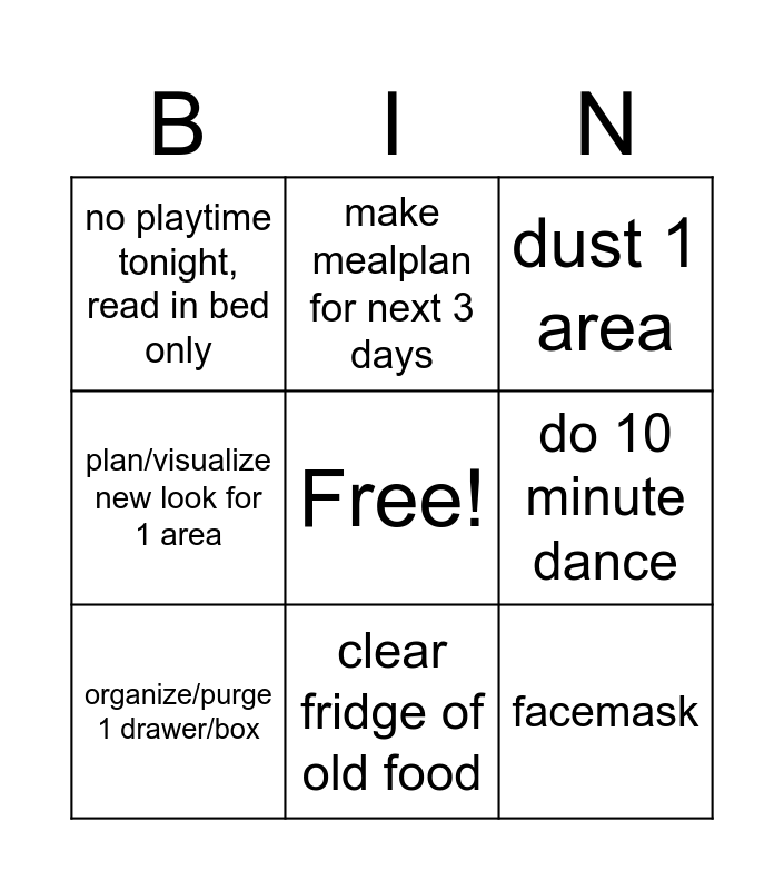 This bingo card has a free space and 61 words: long pet walk to park, half/half day cleaning and work, do the dishes, take out the trash and recycling, make bed, clean 1 area, organize/purge 1 drawer/box, organize/purge 1 surface, drink full glass of milk from sippy cup, eat vegetables snack, plan/visualize new look for 1 area, do 10 minute yoga, do 10 minute dance, do 10 minute light stretch, do bed exercises, no playtime tonight, read in bed only, take a quick shower, facemask, trim nails, clear fridge of old food, vacuum apartment, dust 1 area, clean cat litter, 5 minute meditation, put 5 things in purge box, cuddle plushies 5 minutes, watch kids cartoons while working, listen to self motivation while working, listen to music only while working, watch educational programs only today, 30 minutes pay any bills, 1 hour writing, plan tomorrow's to-do list, sort pile of papers 30 minutes, make mealplan for next 3 days, drink 2 extra glasses of water, eat 2 servings of fruit/veggies, 2 walks today, 3 walks today, early bedtime-before midnight, no caffeine after 2 PM, write 3 things you're grateful for, write 3 affirmations, no social media day, read for 30 minutes, doodle for 10 minutes, bake cookies, brainstorm 10 ideas, text/msg a friend, add $100 to your goal meter, cancel an unused subscription, no screen 1 hour before bed, do something fun alone, put clothing away, pack lunch and walk to park/cafe, organize/purge 1 drawer/box, organize/purge 1 surface, drink full glass of milk from sippy cup, eat vegetables snack, take a long shower and take a bubble bath.