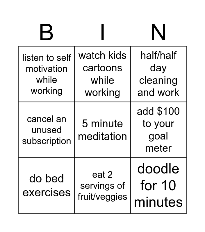 This bingo card has 62 words: Free!, write 3 things you're grateful for, organize/purge 1 drawer/box, no caffeine after 2 PM, 2 walks today, facemask, do bed exercises, put 5 things in purge box, doodle for 10 minutes, clean cat litter, cancel an unused subscription, brainstorm 10 ideas, add $100 to your goal meter, take a bubble bath, listen to music only while working, listen to self motivation while working, do 10 minute light stretch, 5 minute meditation, eat vegetables snack, eat 2 servings of fruit/veggies, pack lunch and walk to park/cafe, half/half day cleaning and work, make mealplan for next 3 days, do something fun alone, do 10 minute yoga, read for 30 minutes, bake cookies, clear fridge of old food, 1 hour writing, watch educational programs only today, do 10 minute dance, no screen 1 hour before bed, write 3 affirmations, put clothing away, take out the trash and recycling, watch kids cartoons while working, take a quick shower, drink 2 extra glasses of water, do the dishes, make bed, organize/purge 1 surface, eat vegetables snack, plan/visualize new look for 1 area, long pet walk to park, drink full glass of milk from sippy cup, trim nails, clean 1 area, drink full glass of milk from sippy cup, no social media day, no playtime tonight, read in bed only, take a long shower, organize/purge 1 drawer/box, 3 walks today, cuddle plushies 5 minutes, early bedtime-before midnight, vacuum apartment, text/msg a friend, 30 minutes pay any bills, plan tomorrow's to-do list, organize/purge 1 surface, dust 1 area and sort pile of papers 30 minutes.
