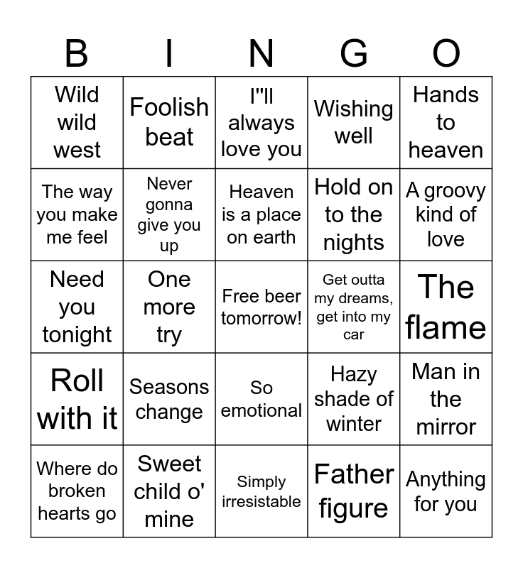 This bingo card has a free space and 41 words: Faith, Need you tonight, Got my mind set on you, Never gonna give you up, Sweet child o' mine, So emotional, Heaven is a place on earth, Could've been, Hands to heaven, Roll with it, One more try, Wishing well, Anything for you, The flame, Get outta my dreams, get into my car, Seasons change, Is this love, Wild wild west, Pour some sugar on me, I''ll always love you, Man in the mirror, Shake your love, Simply irresistable, Hold on to the nights, Hungry eyes, Shattered dreams, Father figure, Naughty girls (need love too), A groovy kind of love, Love bites, Endless summer nights, Foolish beat, Where do broken hearts go, Angel, Hazy shade of winter, The way you make me feel, Don't worry be happy, Make me lose control, Red red wine, She's like the wind and Bad medicine.