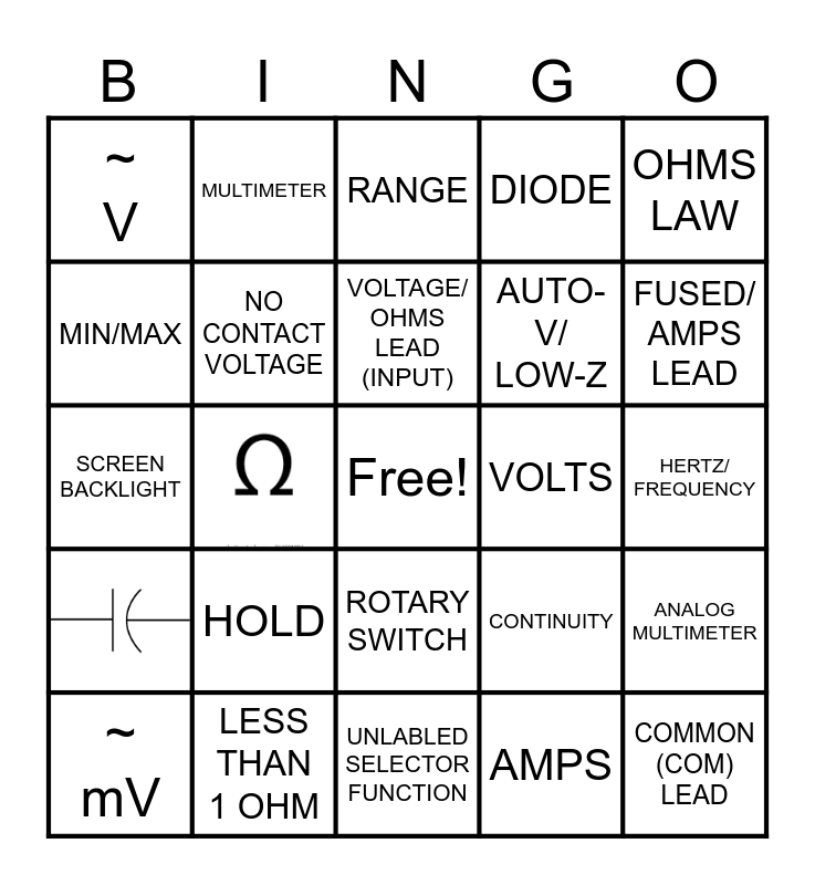This bingo card has 2 images, a free space and 22 words: HOLD, LESS THAN 1 OHM, VOLTAGE/ OHMS LEAD (INPUT), ~ mV, OHMS LAW, ~ V, MIN/MAX, MULTIMETER, VOLTS, ROTARY SWITCH, AUTO-V/ LOW-Z, SCREEN BACKLIGHT, CONTINUITY, ANALOG MULTIMETER, NO CONTACT VOLTAGE, AMPS, HERTZ/ FREQUENCY, RANGE, FUSED/ AMPS LEAD, COMMON (COM) LEAD, DIODE and UNLABLED SELECTOR FUNCTION.