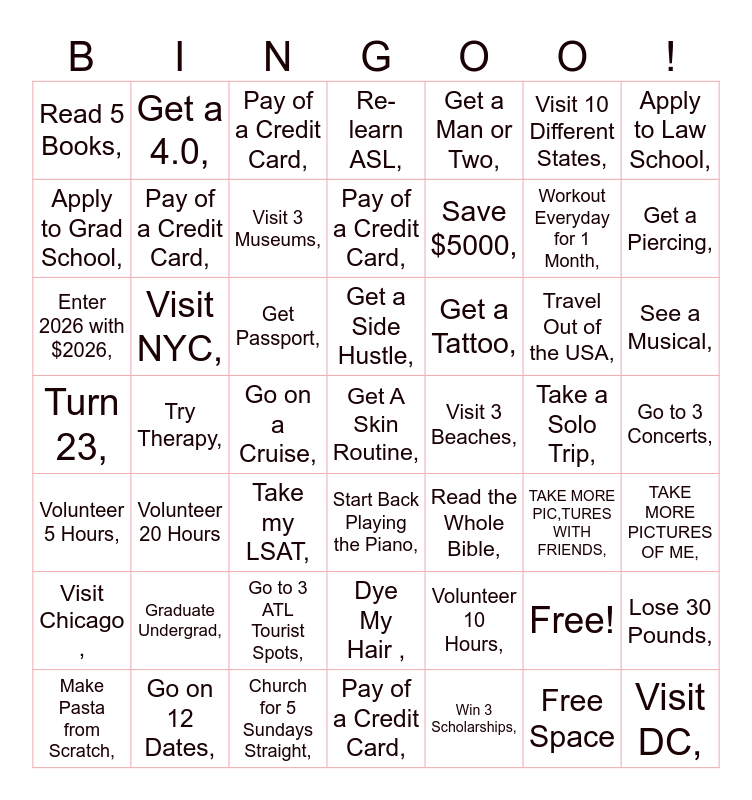 This bingo card has 49 words: Free!, Workout Everyday for 1 Month,, Win 3 Scholarships,, Try Therapy,, Get Passport,, Go to 3 Concerts,, Get a 4.0,, Church for 5 Sundays Straight,, Visit 10 Different States,, Start Back Playing the Piano,, Apply to Law School,, Re-learn ASL,, Travel Out of the USA,, Get a Tattoo,, Graduate Undergrad,, Take a Solo Trip,, Apply to Grad School,, Get a Piercing,, Lose 30 Pounds,, Get a Man or Two,, Save $5000,, Go on a Cruise,, Read 5 Books,, Pay of a Credit Card,, Make Pasta from Scratch,, Visit 3 Museums,, See a Musical,, Go on 12 Dates,, Get a Side Hustle,, Visit NYC,, Visit DC,, Visit 3 Beaches,, Visit Chicago ,, Go to 3 ATL Tourist Spots,, Turn 23,, Read the Whole Bible,, TAKE MORE PIC,TURES WITH FRIENDS,, TAKE MORE PICTURES OF ME,, Enter 2026 with $2026,, Take my LSAT,, Dye My Hair ,, Volunteer 5 Hours,, Get A Skin Routine,, Pay of a Credit Card,, Pay of a Credit Card,, Pay of a Credit Card,, Volunteer 10 Hours,, Volunteer 20 Hours and Free Space.