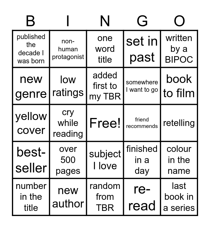 This bingo card has a free space and 24 words: over 500 pages, new author, added first to my TBR, number in the title, written by a BIPOC, published the decade I was born, new genre, non-human protagonist, friend recommends, subject I love, somewhere I want to go, yellow cover, finished in a day, colour in the name, low ratings, re-read, retelling, one word title, book to film, cry while reading, last book in a series, best-seller, set in past and random from TBR.