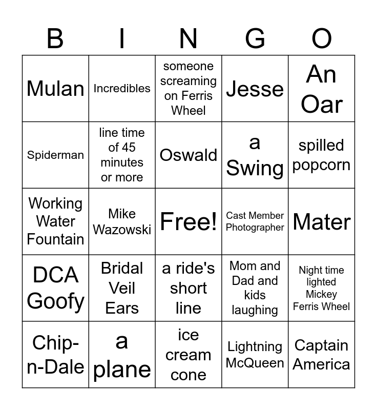 This bingo card has a free space and 29 words: Chip-n-Dale, Trolly, Mike Wazowski, A bridge, Mulan, someone screaming on Ferris Wheel, line time of 45 minutes or more, Bridal Veil Ears, Cast Member Photographer, a plane, Mater, Captain America, ice cream cone, Lightning McQueen, spilled popcorn, Sully, a ride's short line, DCA Goofy, An Oar, Working Water Fountain, Mom and Dad and kids laughing, Parade, a Swing, Spiderman, Jesse, Incredibles, Night time lighted Mickey Ferris Wheel, Oswald and A traffic cone.