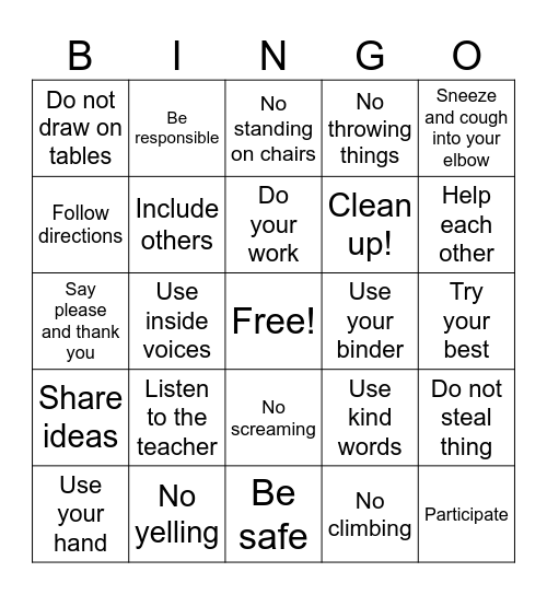 This bingo card has a free space and 24 words: Listen to the teacher, No yelling, Do your work, Use your hand, Sneeze and cough into your elbow, Do not draw on tables, Follow directions, Be responsible, Use your binder, No screaming, Clean up!, Say please and thank you, Use kind words, Do not steal thing, Include others, No climbing, Try your best, No standing on chairs, Help each other, Use inside voices, Participate, Share ideas, No throwing things and Be safe.