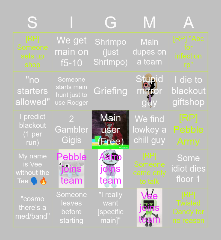 This bingo card has 4 images, a free space and 24 words: Pebble joins team, Someone leaves before starting, Griefing, "cosmo there's a med/band", [RP] "Abc for infection rp", [RP] Someone sets up shop, "no starters allowed", We get main on f5-10, We find lowkey a chill guy, Astro joins team, Stupid mirror guy, I predict blackout (1 per run), [RP] Someone came only to talk, Some idiot dies floor 1, Someone starts main hunt just to use Rodger, Vee joins team, [RP] Pebble Army, Shrimpo (just Shrimpo), I die to blackout giftshop, 2 Gambler Gigis, [RP] Twisted Dandy for no reason, My name is Vee without the Tee 🗣️🔥, Main dupes on a team and "I really want [specific main]".