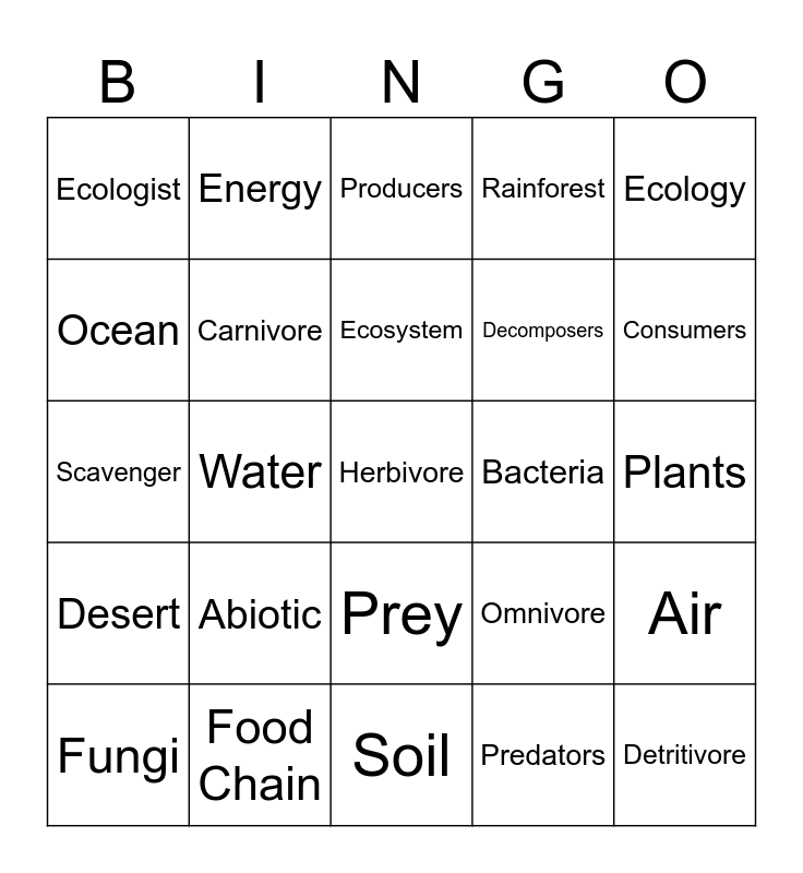 This bingo card has a free space and 29 words: Fungi, Animals, Water, Sunlight, Ecologist, Producers, Carnivore, Abiotic, Bacteria, Food Chain, Plants, Detritivore, Soil, Predators, Consumers, Parasite, Prey, Desert, Ecology, Scavenger, Omnivore, Food Web, Decomposers, Ocean, Rainforest, Energy, Air, Ecosystem and Biotic.