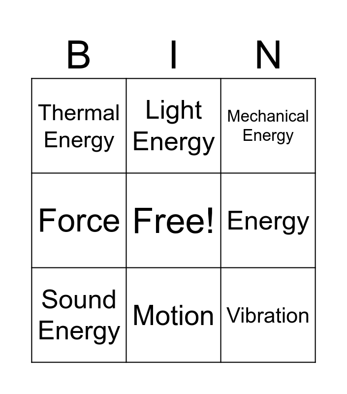 This bingo card has a free space and 8 words: Energy, Mechanical Energy, Light Energy, Sound Energy, Thermal Energy, Vibration, Force and Motion.