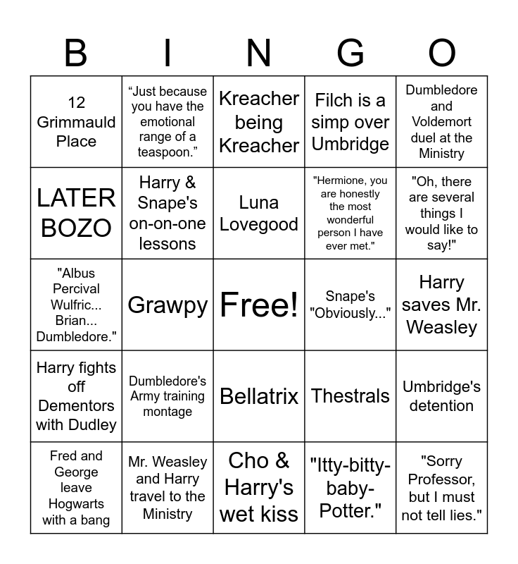 This bingo card has a free space and 24 words: Dumbledore's Army training montage, Mr. Weasley and Harry travel to the Ministry, Luna Lovegood, Fred and George leave Hogwarts with a bang, Dumbledore and Voldemort duel at the Ministry, 12 Grimmauld Place, LATER BOZO, “Just because you have the emotional range of a teaspoon.”, Snape's "Obviously...", Bellatrix, "Hermione, you are honestly the most wonderful person I have ever met.", "Albus Percival Wulfric... Brian... Dumbledore.", Thestrals, Umbridge's detention, Harry & Snape's on-on-one lessons, "Itty-bitty-baby-Potter.", Harry saves Mr. Weasley, Kreacher being Kreacher, "Oh, there are several things I would like to say!", Grawpy, "Sorry Professor, but I must not tell lies.", Harry fights off Dementors with Dudley, Filch is a simp over Umbridge and Cho & Harry's wet kiss.