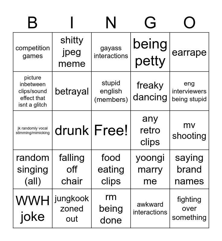 This bingo card has a free space and 24 words: falling off chair, jungkook zoned out, stupid english (members), WWH joke, earrape, competition games, picture inbetween clips/sound effect that isnt a glitch, shitty jpeg meme, any retro clips, food eating clips, freaky dancing, jk randomly vocal stimming/mimicking, yoongi marry me, saying brand names, betrayal, awkward interactions, mv shooting, gayass interactions, eng interviewers being stupid, drunk, fighting over something, random singing (all), being petty and rm being done.