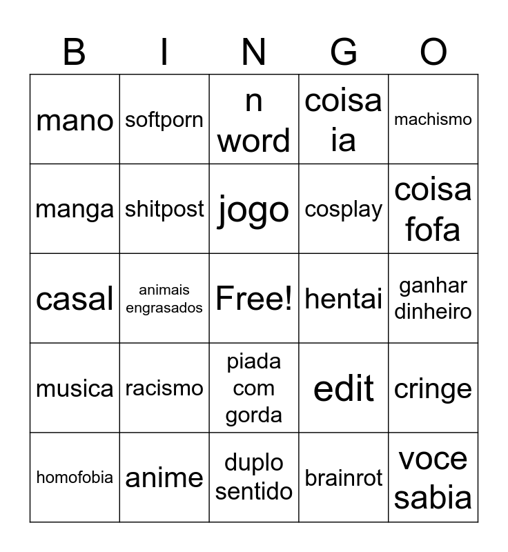 This bingo card has a free space and 24 words: racismo, anime, jogo, homofobia, machismo, mano, manga, softporn, hentai, piada com gorda, cosplay, casal, edit, cringe, shitpost, brainrot, ganhar dinheiro, n word, coisa fofa, animais engrasados, voce sabia, musica, coisa ia and duplo sentido.