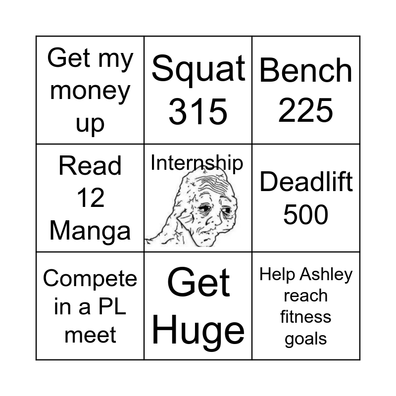 This bingo card has a free space and 8 words: Deadlift 500, Bench 225, Squat 315, Compete in a PL meet, Get my money up, Help Ashley reach fitness goals, Read 12 Manga and Get Huge.