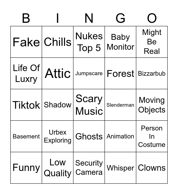 This bingo card has a free space and 24 words: Urbex Exploring, Low Quality, Jumpscare, Funny, Might Be Real, Fake, Life Of Luxry, Chills, Slenderman, Ghosts, Forest, Tiktok, Animation, Person In Costume, Attic, Whisper, Moving Objects, Nukes Top 5, Bizzarbub, Shadow, Clowns, Basement, Baby Monitor and Security Camera.