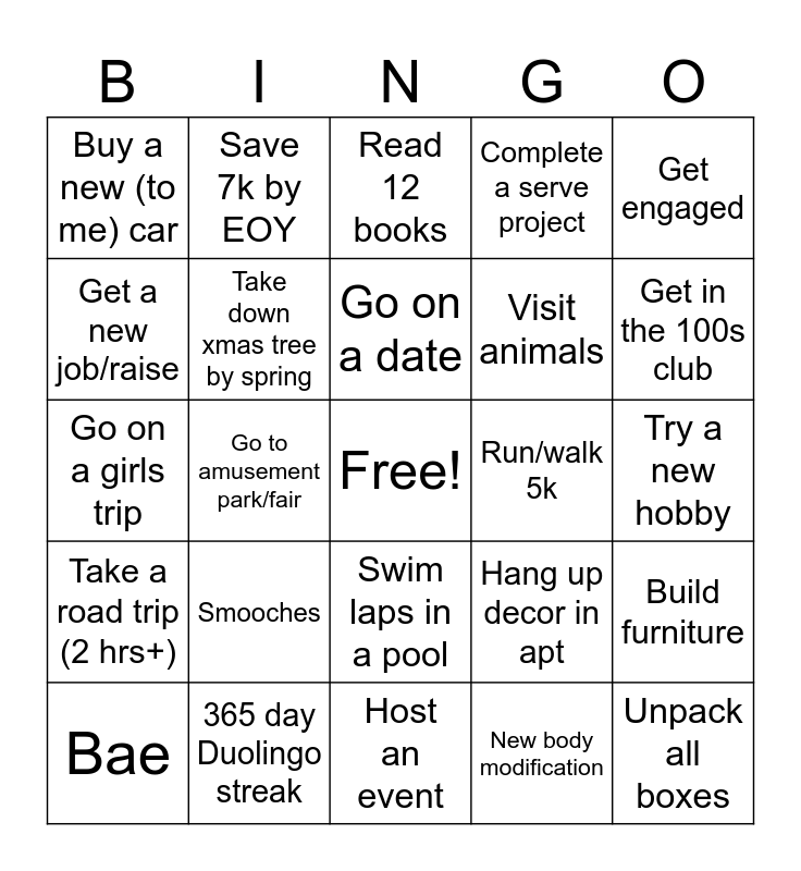 This bingo card has a free space and 24 words: Smooches, 365 day Duolingo streak, Go on a date, Bae, Get engaged, Buy a new (to me) car, Get a new job/raise, Save 7k by EOY, Run/walk 5k, Swim laps in a pool, Visit animals, Go on a girls trip, Hang up decor in apt, Build furniture, Take down xmas tree by spring, New body modification, Try a new hobby, Read 12 books, Get in the 100s club, Go to amusement park/fair, Unpack all boxes, Take a road trip (2 hrs+), Complete a serve project and Host an event.