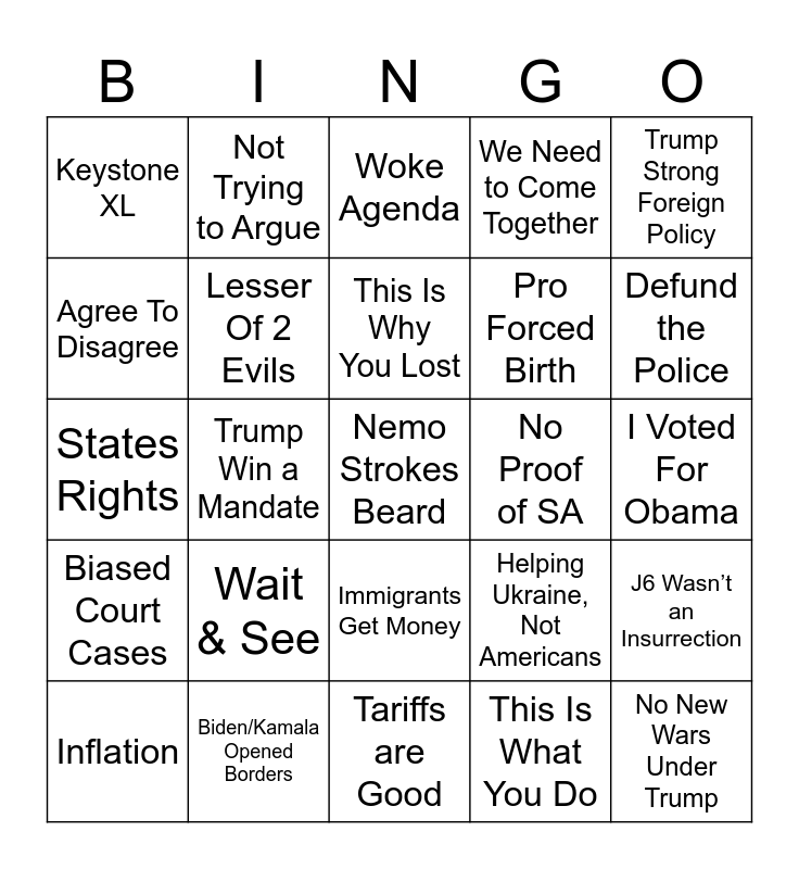This bingo card has a free space and 40 words: Foreign Trumper, States Rights, Kamala Border Czar, Lesser Of 2 Evils, Biden/Kamala Opened Borders, Immigrants Get Money, This Is Why You Lost, Trump Not P2025, Trump Strong Foreign Policy, Biased Court Cases, Trump Win a Mandate, We Need to Come Together, No New Wars Under Trump, I Voted For Obama, No Proof of SA, Wait & See, Grammar Lessons, Keystone XL, Selected not Elected, Woke Agenda, J6 Wasn’t an Insurrection, This Is What You Do, Pro Forced Birth, Agree To Disagree, Better 4 Years Ago, Kamala Not Qualified, Migrant Gangs, Common Sense, I’m an Independent/ Not D or R, Manufacturing Coming Back, Phobias/isms/ Misogyny, Inflation, What About, Helping Ukraine, Not Americans, Defund the Police, Tariffs are Good, Maga on Panel Gets Muted, Better Taxes Under Trump, Not Trying to Argue and 🐬in the Harbor.