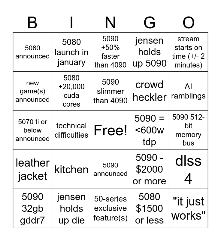 This bingo card has a free space and 24 words: kitchen, jensen holds up die, 5090 slimmer than 4090, 5090 32gb gddr7, stream starts on time (+/- 2 minutes), 5080 announced, new game(s) announced, 5080 launch in january, 5090 = <600w tdp, 5090 announced, crowd heckler, 5070 ti or below announced, 5090 - $2000 or more, dlss 4, 5080 +20,000 cuda cores, 5080 $1500 or less, 5090 512-bit memory bus, 5090 +50% faster than 4090, AI ramblings, technical difficulties, "it just works", leather jacket, jensen holds up 5090 and 50-series exclusive feature(s).