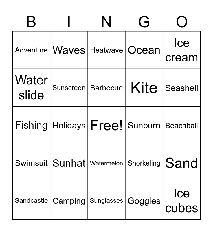 This bingo card has a free space and 33 words: Sunshine, Beach, Holidays, Surfing, Swimsuit, Sunscreen, Ice cream, Sandcastle, Waves, Picnic, Barbecue, Heatwave, Lifeguard, Pool, Sunburn, Seashell, Camping, Fishing, Sunhat, Snorkeling, Watermelon, Mosquito, Adventure, Beachball, Sunglasses, Ice cubes, Ocean, Kite, Water slide, Sand, Crab, Goggles and Starfish.