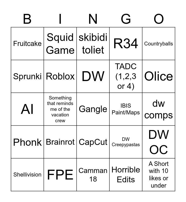 This bingo card has a free space and 24 words: Brainrot, FPE, DW, Shellivision, Countryballs, Fruitcake, Sprunki, Squid Game, IBIS Paint/Maps, CapCut, TADC (1,2,3 or 4), AI, DW Creepypastas, DW OC, Roblox, Horrible Edits, dw comps, skibidi toliet, Olice, Something that reminds me of the vacation crew, A Short with 10 likes or under, Phonk, R34 and Camman 18.