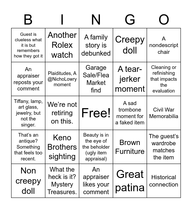 This bingo card has a free space and 27 words: Brown Furniture, Mid-Century Modern mentioned, A tear-jerker moment, An appraiser likes your comment, An appraiser reposts your comment, A family story is debunked, Another Rolex watch, That’s an antique? Something that feels too recent., A sad trombone moment for a faked item, The guest’s wardrobe matches the item, Tiffany, lamp, art glass, jewelry, but not the singer., Creepy doll, Non creepy doll, What the heck is it? Mystery Treasures., Cleaning or refinishing that impacts the evaluation, Fun, Frivolity and Feedback Booth merriment, Plaiditudes, A @NichoLowry moment, Garage Sale/Flea Market find, Keno Brothers sighting, Guest is clueless what it is but remembers how they got it, Civil War Memorabilia, Great patina, We’re not retiring on this., Historical connection, Beauty is in the eye of the beholder (ugly item appraisal), A nondescript chair and A gem of an appraisal on the family jewels.