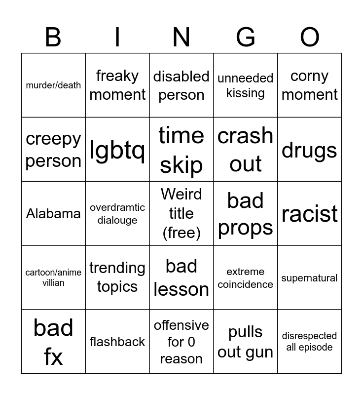 This bingo card has a free space and 24 words: trending topics, flashback, time skip, bad fx, corny moment, murder/death, creepy person, freaky moment, bad props, bad lesson, crash out, Alabama, extreme coincidence, supernatural, lgbtq, pulls out gun, racist, disabled person, drugs, overdramtic dialouge, disrespected all episode, cartoon/anime villian, unneeded kissing and offensive for 0 reason.