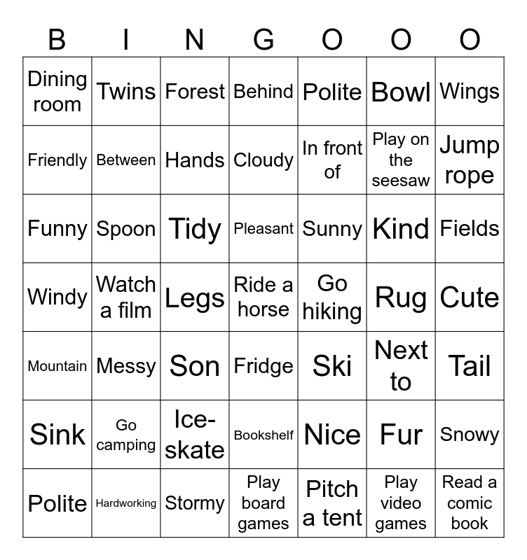 This bingo card has 64 words: Clever, Cute, Daughter, Kind, Son, Polite, Twins, Cheerful, Friendly, Hardworking, Pleasant, Nice, Funny, Polite, Cool, Bowl, In front of, Dining room, Plate, Between, Tidy, Spoon, Behind, Messy, Table, Next to, Fridge, Under, Rug, Sink, Sofa, Bookshelf, Floor, Toy box, Hands, Fields, Fur, Legs, Tail, Wings, Cloudy, Jump rope, Snowy, Play hide-and-seek, Stormy, Play on the seesaw, Windy, Ride a horse, Sunny, Play board games, Play video games, Read a comic book, Watch a film, Mountain, Go fishing, Ice-skate, Forest, Play ice-hockey, Ski, Go camping, Pitch a tent, Walk the dog, Go hiking and Have a picnic.