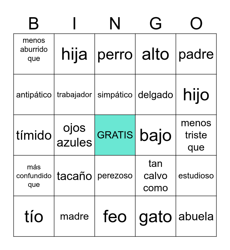 This bingo card has a free space and 44 words: hermano, abuela, primo, tío, tía, gato, perro, abuelo, padre, madre, alto, bajo, perezoso, tacaño, guapo, feo, bonita, tímido, gracioso, hijo, hija, tan serio como, más inteligente que, menos aburrido que, tan fuerte como, menos triste que, más contento que, prima, tan calvo como, más confundido que, menos tranquilo que, estudioso, hermanastro, hermanastra, ojos azules, cansado, ojos verdes, ojos marrones, simpático, antipático, delgado, pelirrojo, trabajador and enfermo.