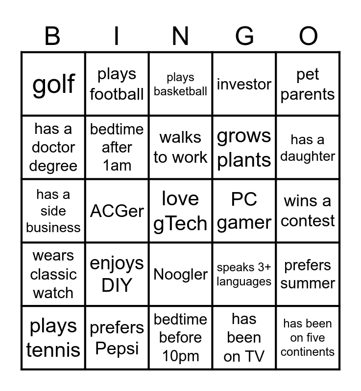 This bingo card has a free space and 34 words: wake up before 7am, has been on TV, >5yr Google tenure, plays musical instrument, wears classic watch, bedtime after 1am, pet parents, plays tennis, plays football, left handed, walks to work, plays basketball, drinker, coding, PC gamer, has a daughter, prefers Pepsi, has a side business, enjoys DIY, speaks 3+ languages, Noogler, likes spicy food, golf, wins a contest, bedtime before 10pm, has been on five continents, investor, born in another county, grows plants, has a doctor degree, afraid of heights, ACGer, prefers summer and sits near window.