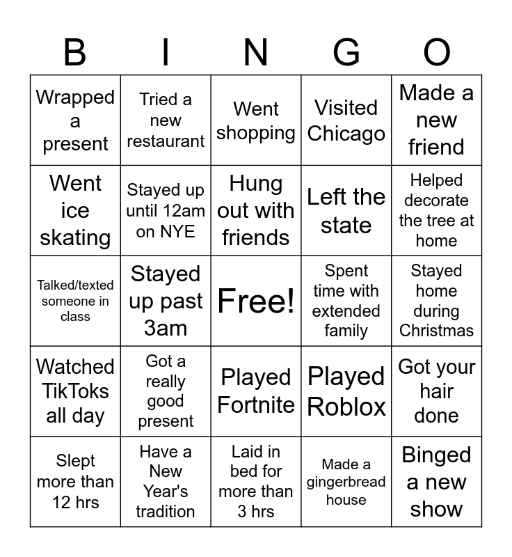 This bingo card has a free space and 29 words: Slept more than 12 hrs, Went to the movies, Stayed up past 3am, Left town for the holidays, Wrapped a present, Went shopping, Stayed up until 12am on NYE, Got a really good present, Spent time with extended family, Have a New Year's tradition, Stayed home during Christmas, Binged a new show, Laid in bed for more than 3 hrs, Made a gingerbread house, Helped decorate the tree at home, Made cookies for Christmas, Played Fortnite, Watched TikToks all day, Made a new friend, Talked/texted someone in class, Played Roblox, Had a sleepover, Left the state, Went ice skating, Visited Chicago, Tried a new restaurant, Got your hair done, Hung out with friends and Listened to new music.