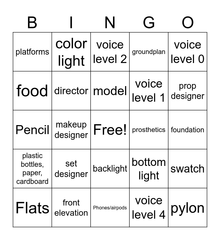 This bingo card has a free space and 38 words: costume designer, water, gum, director, swatch, set designer, model, raise your hand, voice level 0, voice level 1, makeup designer, groundplan, pylon, foundation, food, plastic bottles, paper, cardboard, School Bell, voice level 2, voice level 3, prosthetics, platforms, front elevation, prop designer, Flats, steps, Phones/airpods, Ramp, light designer, front light, side light, natural light, backlight, voice level 4, color light, top light, bottom light, Pencil and Wear ID.