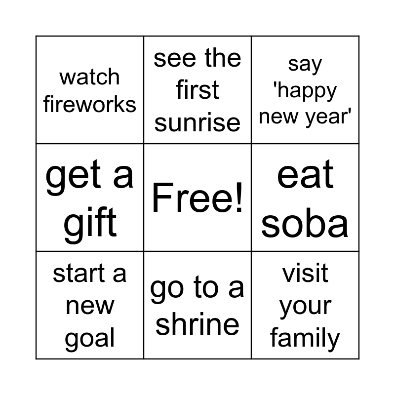 This bingo card has a free space and 8 words: eat soba, say 'happy new year', see the first sunrise, start a new goal, watch fireworks, visit your family, get a gift and go to a shrine.