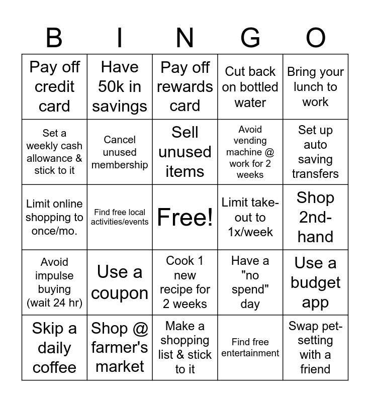 This bingo card has a free space and 24 words: Skip a daily coffee, Use a coupon, Sell unused items, Find free entertainment, Bring your lunch to work, Pay off credit card, Have 50k in savings, Pay off rewards card, Limit take-out to 1x/week, Shop 2nd-hand, Limit online shopping to once/mo., Cancel unused membership, Have a "no spend" day, Use a budget app, Set a weekly cash allowance & stick to it, Shop @ farmer's market, Make a shopping list & stick to it, Cut back on bottled water, Set up auto saving transfers, Avoid impulse buying (wait 24 hr), Find free local activities/events, Cook 1 new recipe for 2 weeks, Avoid vending machine @ work for 2 weeks and Swap pet-setting with a friend.