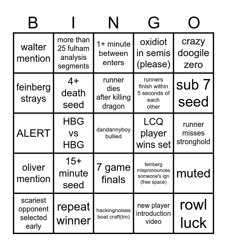 This bingo card has 25 words: 15+ minute seed, hackingnoises boat craft(tm), runner dies after killing dragon, scariest opponent selected early, crazy doogile zero, walter mention, feinberg strays, more than 25 fulham analysis segments, LCQ player wins set, 7 game finals, runners finish within 5 seconds of each other, ALERT, feinberg mispronounces someone's ign (free space), muted, 4+ death seed, rowl luck, runner misses stronghold, 1+ minute between enters, sub 7 seed, HBG vs HBG, dandannyboy bullied, repeat winner, oliver mention, oxidiot in semis (please) and new player introduction video.