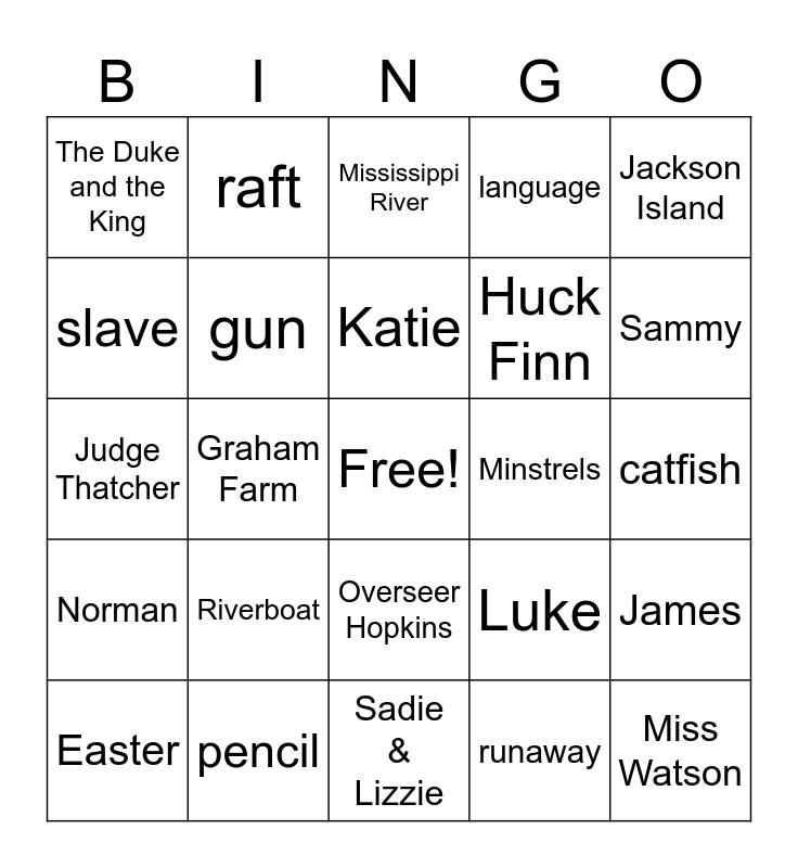 This bingo card has a free space and 28 words: James, Percival Everett, Huck Finn, runaway, slave, Mississippi River, raft, Norman, Minstrels, Easter, Judge Thatcher, language, pencil, Sadie & Lizzie, Sammy, Hannibal Missouri, Riverboat, gun, Katie, Overseer Hopkins, The Duke and the King, lashes, Miss Watson, Graham Farm, catfish, Luke, Jackson Island and notebook.