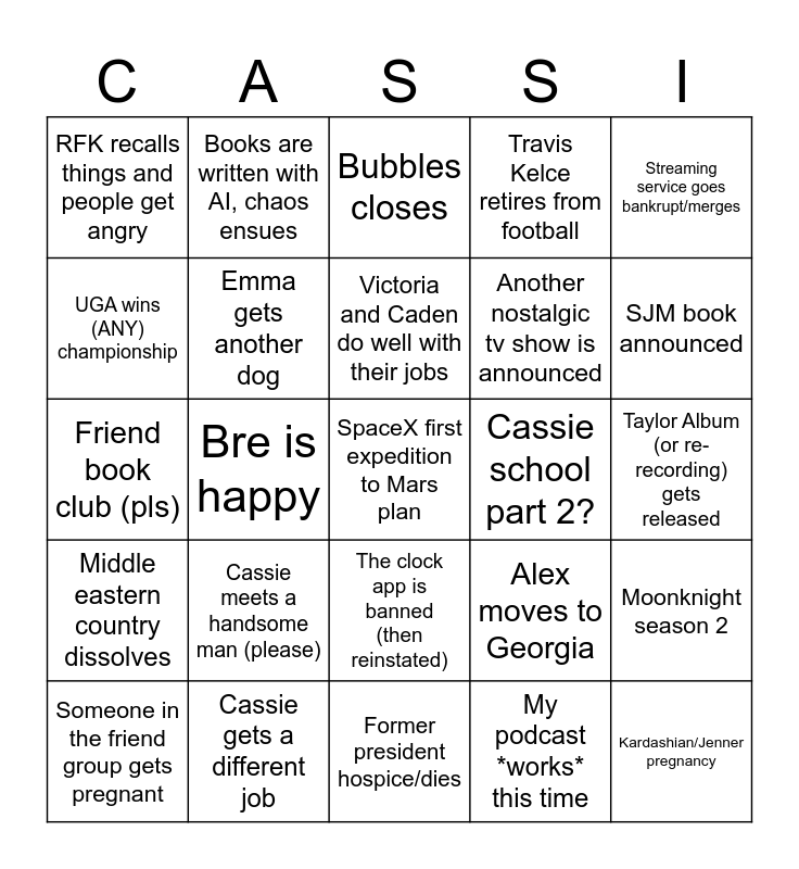 This bingo card has 25 words: Cassie meets a handsome man (please), Former president hospice/dies, Victoria and Caden do well with their jobs, Someone in the friend group gets pregnant, Streaming service goes bankrupt/merges, RFK recalls things and people get angry, UGA wins (ANY) championship, Books are written with AI, chaos ensues, Cassie school part 2?, The clock app is banned (then reinstated), Another nostalgic tv show is announced, Friend book club (pls), Alex moves to Georgia, Moonknight season 2, Emma gets another dog, Kardashian/Jenner pregnancy, Taylor Album (or re-recording) gets released, Bubbles closes, SJM book announced, Bre is happy, SpaceX first expedition to Mars plan, Cassie gets a different job, Middle eastern country dissolves, Travis Kelce retires from football and My podcast *works* this time.