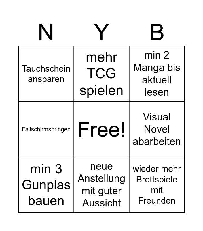 This bingo card has a free space and 9 words: min 3 Gunplas bauen, min 2 Manga bis aktuell lesen, mehr TCG spielen, Fallschirmspringen, Tauchschein ansparen, Visual Novel abarbeiten, wieder mehr Brettspiele mit Freunden, Mentalhealth verbessern and neue Anstellung mit guter Aussicht.