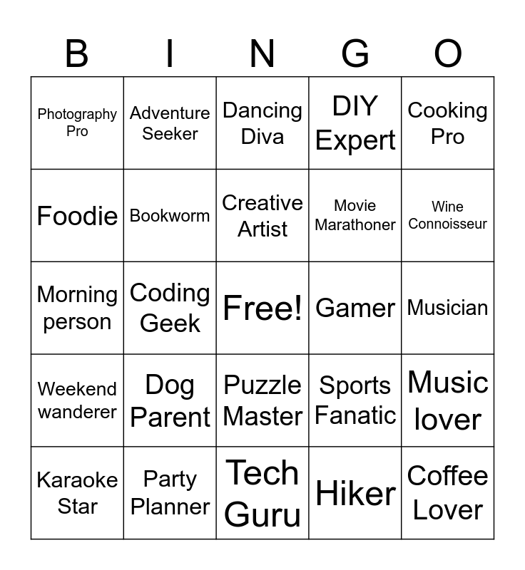 This bingo card has 1 images, a free space and 49 words: Coffee Lover, Travel Enthusiast, Tech Guru, Dog Parent, Cat Lover, Adventure Seeker, Movie Buff, Foodie, Fitness Fanatic, Bookworm, DIY Expert, Music lover, Sports Fanatic, Nature Lover, Fashionista, Creative Artist, Gamer, Yoga Enthusiast, Cooking Pro, Coding Geek, Hiker, Photography Pro, Movie Marathoner, Plant Parent, Road Tripper, Wine Connoisseur, Fitness Freak, Dancing Diva, Puzzle Master, Travel Blogger, Festival Goer, Environmentalist, Thrill Seeker, Party Planner, Art Aficionado, Sudoku Solver, Mindfulness Practitioner, Poker Player, Musician, Kdrama Fan, Gaming Fanatic, Beach Lover, Running Enthusiast, Karaoke Star, Morning person, Vintage Collector, Night owl, Weekend wanderer and Social butterfly.