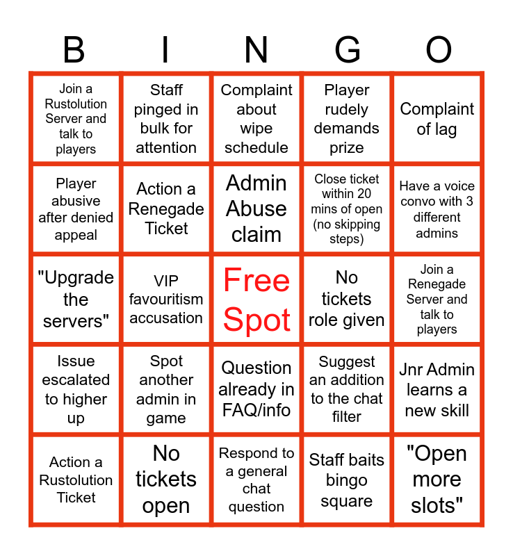 This bingo card has a free space and 24 words: Spot another admin in game, No tickets open, Admin Abuse claim, Action a Rustolution Ticket, Complaint of lag, Join a Rustolution Server and talk to players, Player abusive after denied appeal, Staff pinged in bulk for attention, No tickets role given, Question already in FAQ/info, Close ticket within 20 mins of open (no skipping steps), "Upgrade the servers", Suggest an addition to the chat filter, Jnr Admin learns a new skill, Action a Renegade Ticket, Staff baits bingo square, Join a Renegade Server and talk to players, Complaint about wipe schedule, Have a voice convo with 3 different admins, VIP favouritism accusation, "Open more slots", Issue escalated to higher up, Player rudely demands prize and Respond to a general chat question.