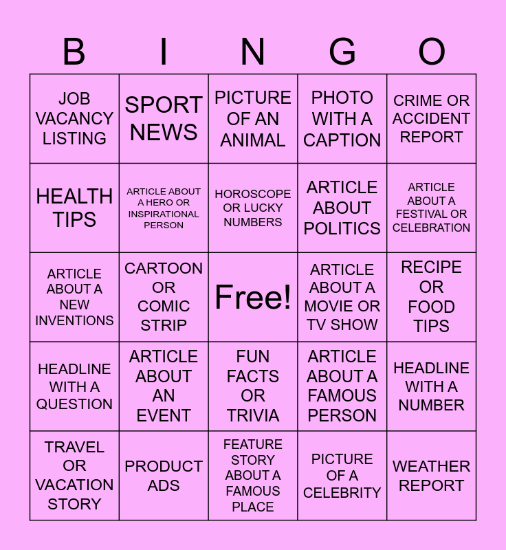 This bingo card has a free space and 24 words: ARTICLE ABOUT AN EVENT, PRODUCT ADS, HOROSCOPE OR LUCKY NUMBERS, TRAVEL OR VACATION STORY, CRIME OR ACCIDENT REPORT, JOB VACANCY LISTING, HEALTH TIPS, SPORT NEWS, ARTICLE ABOUT A MOVIE OR TV SHOW, FUN FACTS OR TRIVIA, ARTICLE ABOUT POLITICS, ARTICLE ABOUT A NEW INVENTIONS, ARTICLE ABOUT A FAMOUS PERSON, HEADLINE WITH A NUMBER, ARTICLE ABOUT A HERO OR INSPIRATIONAL PERSON, PICTURE OF A CELEBRITY, RECIPE OR FOOD TIPS, PICTURE OF AN ANIMAL, ARTICLE ABOUT A FESTIVAL OR CELEBRATION, CARTOON OR COMIC STRIP, WEATHER REPORT, HEADLINE WITH A QUESTION, PHOTO WITH A CAPTION and FEATURE STORY ABOUT A FAMOUS PLACE.